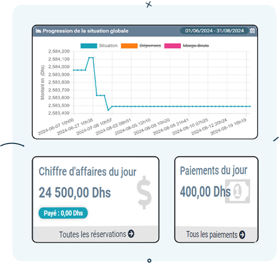 Avec BOOKASFAR, gérez facilement vos finances, factures, et paiements. Suivez vos revenus, dépenses, et optimisez votre comptabilité grâce à des rapports détaillés et en temps réel, tout en automatisant les tâches administratives pour garantir une gestion financière fluide de votre agence de voyage.